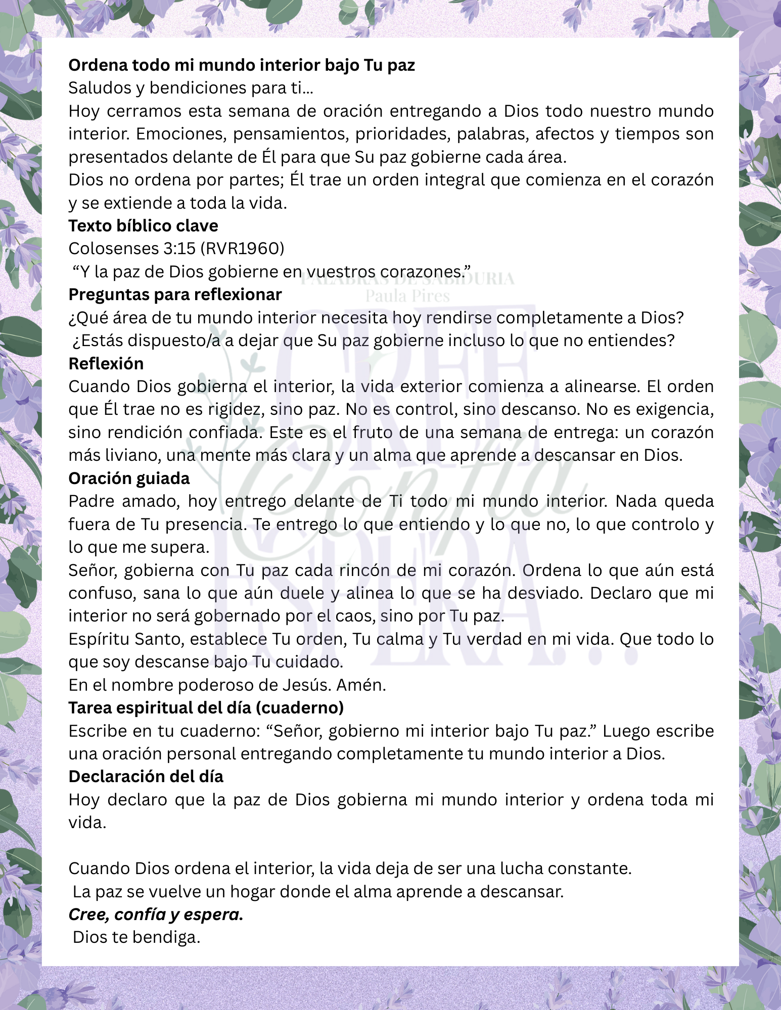 Está pensado para quienes deciden detenerse, rendirse y volver a creer, confiar y esperar, sabiendo que cuando Dios ordena el interior, toda la vida comienza a encontrar su lugar.